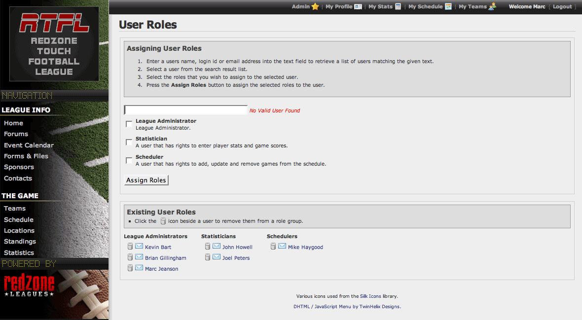 In a smaller league, you may be the only person administering your website. In a larger league, you might want to have a few people help you out. With Redzone's task delegation facilities, you can assign roles to people such as statisticians or schedulers. These people can then do the functions that you give them access to, but you can still maintain the site as the "super user".